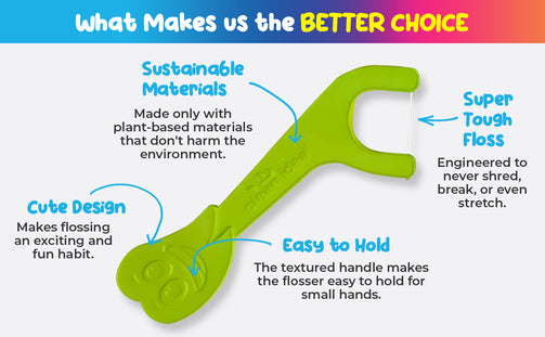SUSTAINABLE - only plant-based resins and starches used in our EcoFlosser handles, no petroleum based plastics like competitors