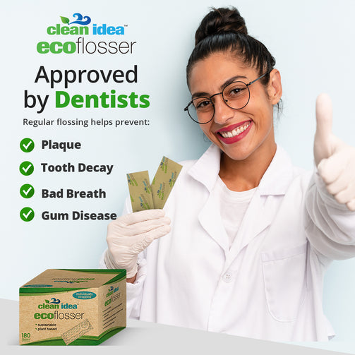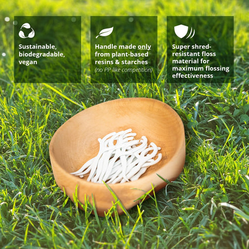 SUSTAINABLE - only plant-based resins and starches used in our EcoFlosser handles, no petroleum based plastics like competitors